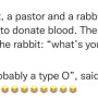 A priest, a pastor and a rabbit entered a clinic to donate blood. The nurse asked the rabbit: “What’s your blood type?”